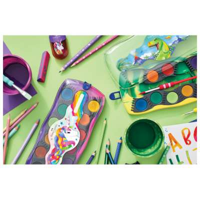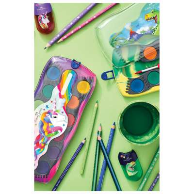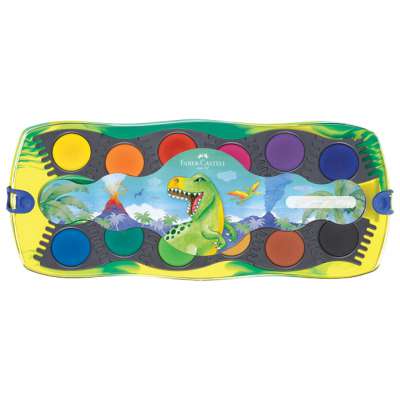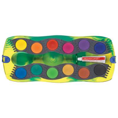 Specifikacija: 12 boja; fi 24 mm; bijela tempera i list naljepnica; na prozirnom poklopcu je paleta sa 5 bijelih posudica; poklopac se može odvojiti i jednostavno očistiti (spaja se sa dvije kopče); na poklopcu je mjesto za upisivanje imena; svijetle boje s visokom neprozirnošću i mogućnošću pokrivanja; za različite vrste slikarskih tehnika; svaka boja je u svojoj kućici koje se mogu proizvoljno slagati u razne oblike; idealano za bojanje, slaganje i igranje; razvijeno u skladu s najnovijim standardima učenja; PVC kutija